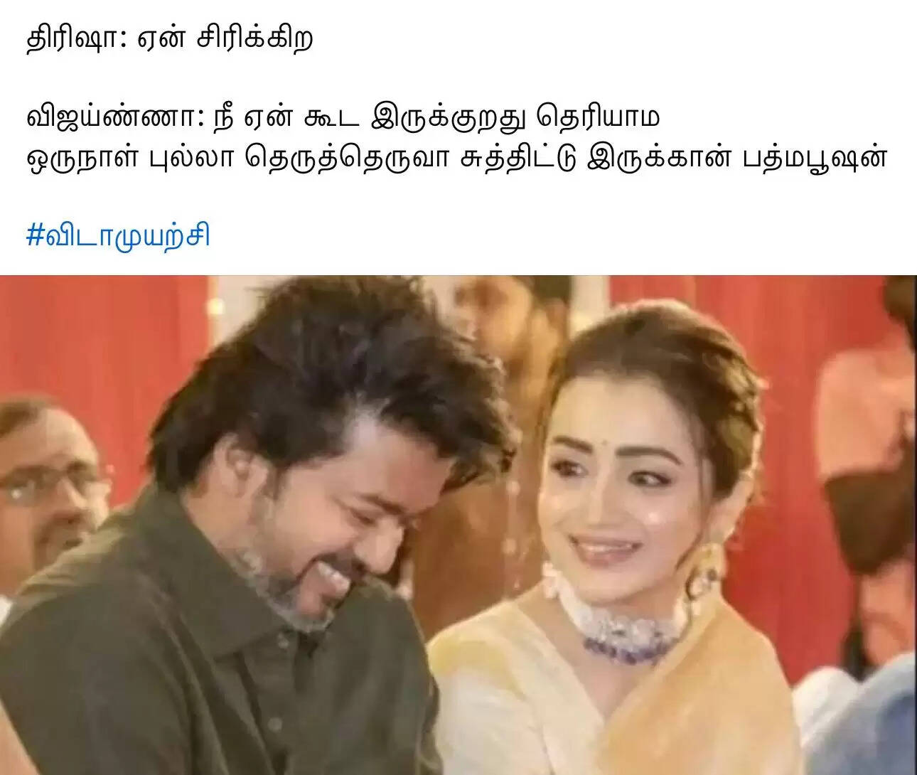 இந்நிலையில் படத்தில் அஜித்தின் பாத்திரத்தைக் குறிப்பிடும் வகையில் விஜய் - த்ரிஷா படத்துடன் மீம்ஸ் ஒன்று சமூகத்தளத்தில் வைரலாகி வருகிறது. அதில் த்ரிஷாவும் விஜய் யும் பேசிக் கொள்வது போல் கூறியுள்ளதாவது,