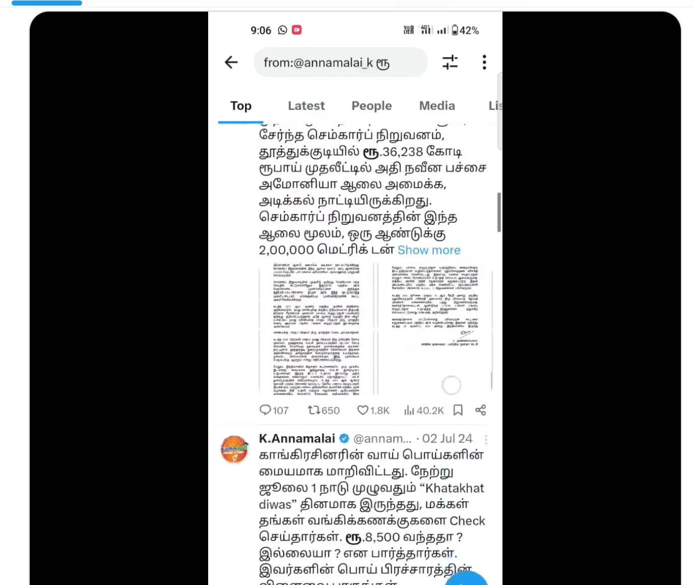 இந்நிலையில் அண்ணாமலையின் எக்ஸ் தள பதிவுகளில் அவர் “ரூ” என்ற எழுத்தைத் தான் பயன்படுத்தி வருகிறார். இந்திய நாணய சின்னத்தை பயன்படுத்தவில்லை என்ற பதிவு வைரலாகி வருகிறது. அண்ணாமலையின் பதிவுகளில் ரூ என்ற எழுத்தைத் தேடி அதில் வரும் பதிவுகளை வீடியோவாக வெளியிட்டுள்ளனர்.