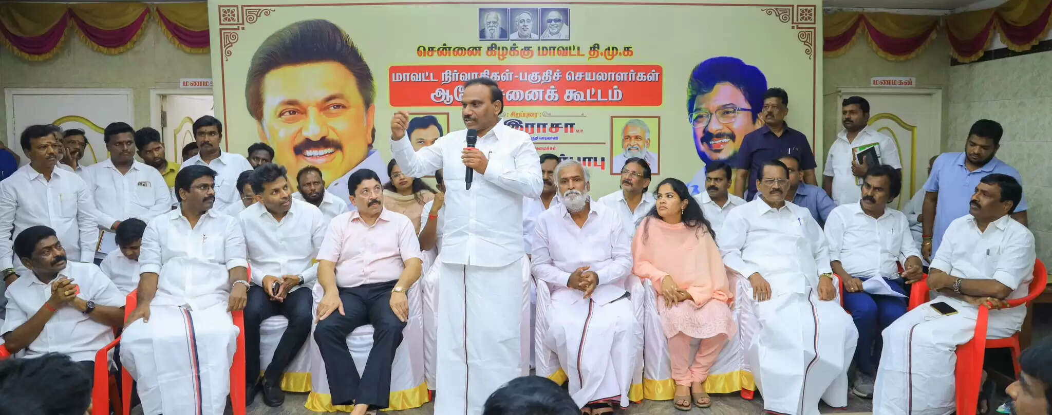 கனிமொழி, ஆ.ராசா, கே.என்.நேரு. எ.வ.வேலு, தங்கம் தென்னரசு, சக்கரபாணி, செந்தில் பாலாஜி ஆகியோர் நியமிக்கப்பட்டுள்ளனர். சென்னை தெற்கு, தென் மேற்கு மாவட்ட நிர்வாகிகள் கூட்டம் ஆ.ராசா தலைமையில் நடைபெற்றது. அடுத்ததாக சென்னை கிழக்கு மாவட்ட நிர்வாகிகள் கூட்டத்திலும் ஆ.ராசா பங்கேற்றார்.