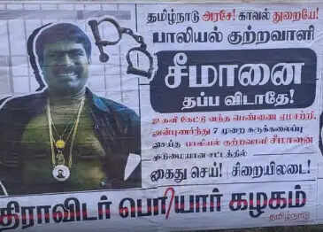 சென்னையில் திராவிடர் பெரியார் கழகம் சார்பில், தமிழ்நாடு அரசே, காவல் துறையே, பாலியல் குற்றவாளி சீமானை தப்ப விடாதே” என்ற கோரிக்கையுடன் சுவரொட்டிகள் ஓட்டப்பட்டுள்ளது. உதவி கேட்டு வந்த பெண்ணை ஏமாற்றி வன்புணர்ந்து 7 முறை கருக்கலைப்பு செய்த பாலியல் குற்றவாளி சீமானை கடுமையான சட்டத்தில் கைது செய், சிறையிலடை என்ற வாசகமும் அதில் இடம்பெற்றுள்ளது.