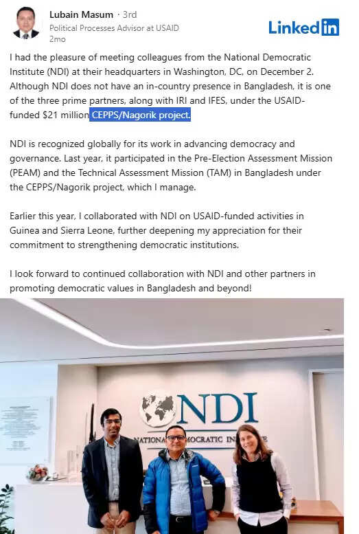 USAID அமெரிக்க அமைப்பின் அரசியல் ஆலோசகராக பணியாற்றும் லுபியன் மசும் என்பவர் தன்னுடைய லிங்க்ட் இன் பக்கத்தில் ஒரு பதிவை இரண்டு மாதங்களுக்கு முன்னர் பதிவிட்டிருக்கிறார். அதில் தேசிய ஜனநாயக நிறுவனத்தின் உதவியுடன் பங்களாதேஷ் நாட்டின் தேர்தல் பணிகளுக்காக 21 மில்லியன் டாலர்கள் நிதியுதவி செய்தோம், தேசிய ஜனநாயக அமைப்புக்கு பங்களாதேஷ் நாட்டில் நேரடி அலுவலகம் இல்லாததால் IRI ம்ற்றும் IFES அமைப்புகளுடன் இணைந்தே அங்கே பணியாற்றுகிறது. இதன் மூலம் CEPPS/Nagorik project. திட்டத்திற்காக USAID 21 மில்லியன் டாலர்கள் நிதியுதவி செய்தது என்று குறிப்பிட்டுள்ளார்.