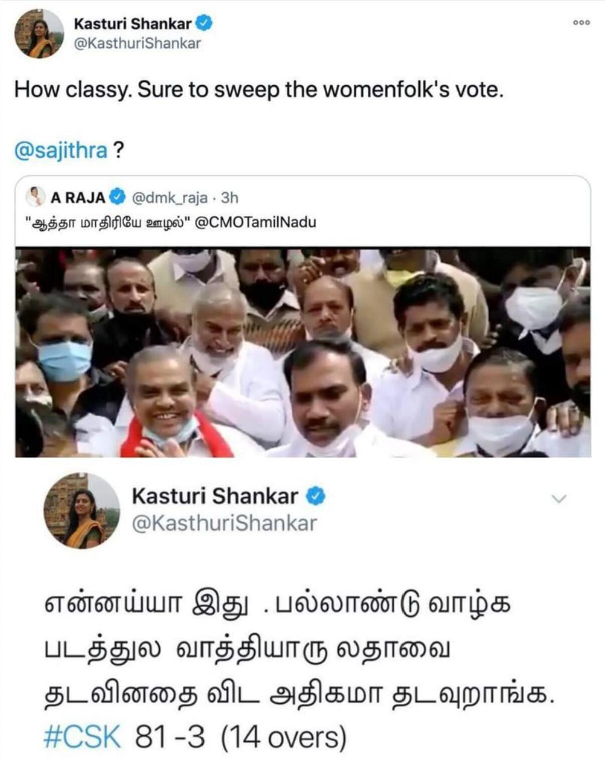மற்றொரு புறம் நடிகை கஸ்தூரி, ஆ.ராசாவின் இந்த ட்வீட்டுக்கு பதிலளித்துள்ளார். அதில், “ என்ன ஒரு அழகான எழுத்து நடை. பெண்களின் வாக்குகள் நிச்சயமாக அள்ளிக் கொண்டு போகும்” என்று நக்கலாக கூறியுள்ளார். நடிகை கஸ்தூரியின் ட்வீட்டுடன் அவர் முன்பு சென்னை சூப்பர் கிங்ஸ் அணியின் விளையாட்டை விமர்சித்து எழுதியிருந்த ட்வீட்டை இணைத்து கேள்வி எழுப்பியுள்ளனர் நெட்டிசன்ஸ்.