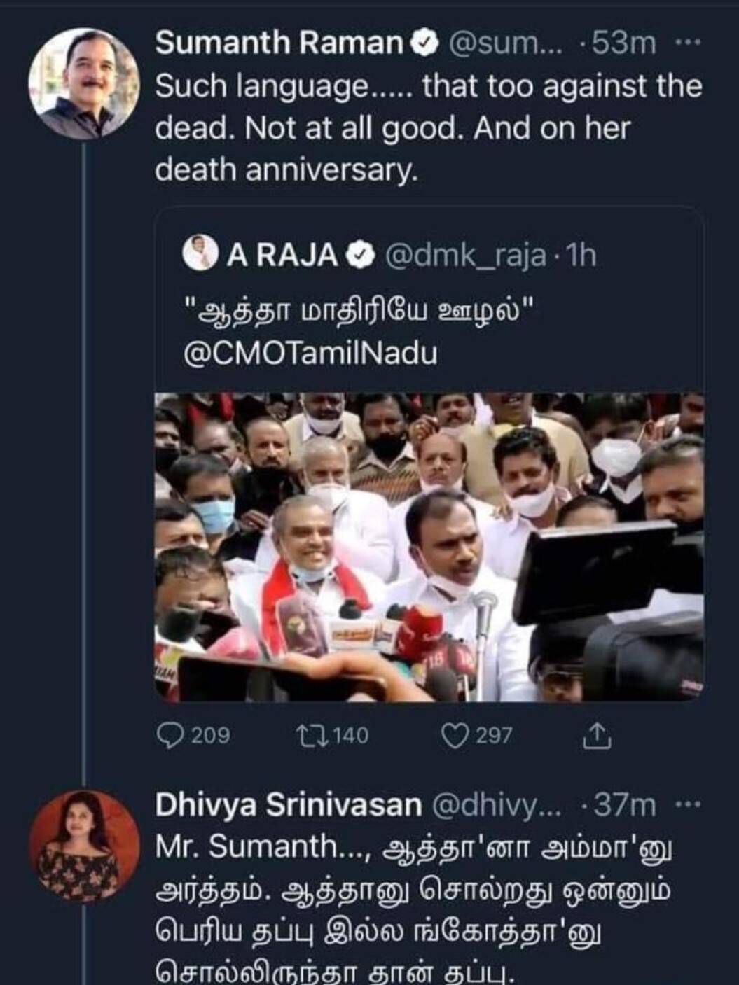 ஆ.ராசாவின் இந்தப் பதிவுக்கு அரசியல் விமர்சகர் சுமந்த் ராமன் என்பவர், “ இப்படி ஒரு வார்த்தை நடையா? அதுவும் இறந்து போன ஒருவரைப்பற்றி. அவருடைய நினைவு நாளில் இது நல்லாவே இல்லை” என்று ட்வீட் செய்திருந்தார். சுமந்த் ராமனுக்கு பதிலளித்துள்ள திவ்யா ஸ்ரீனிவாசன் என்பவர், “ ஆத்தா னா அம்மான்னு அர்த்தம். ஆத்தான்னு சொல்றது ஒன்னும் பெரிய தப்பு இல்லே” என்று குறிப்பிட்டுள்ளார்.
